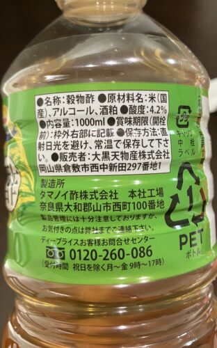 ちなみにトップバリューなどのPB商品が500ml 税別98円、ミツカンなど有名メーカーで500ml 130~150円くらいで販売されています。