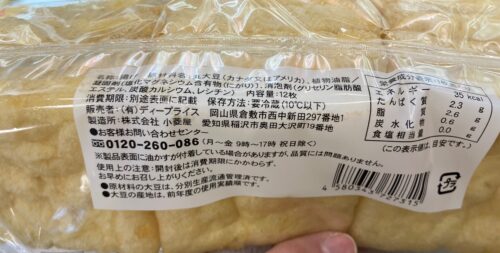 一般的な油揚げと原材料は同じです。ちなみに油揚げは、主に大豆(国産または外国産)から作られる豆腐(主に木綿)を薄く切って水切り、それを食用植物油で揚げて作られるようです!